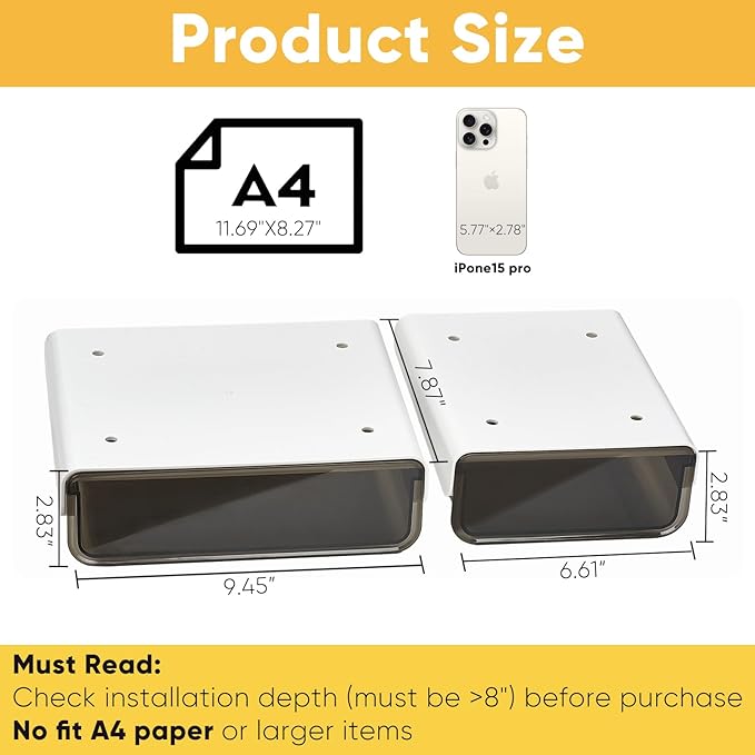 - 【EASY INSTALLATION】This under desk drawer organizer is easy to install with self-adhesive strips and pre-drilled holes for screws. Ideal for under table storage, offering flexible setup without tools or drilling