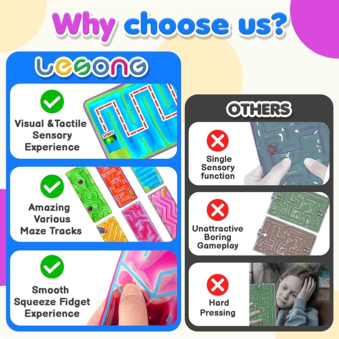 - Patented Design Quiet Fidget Sensory Toys: Kids love them and adults love them too! Relieve stress and anxiety, eliminate emotional outbursts and anger as you squeeze the squishy balls through the maze. These kids fidget toys are perfect for helping students calm down when they get frustrated with homework or toddlers have tantrums. They are also a good sensory fidget toys to help adults focus more and release stress at work, and the silent design is a great way to not worry about causing interruptions