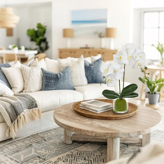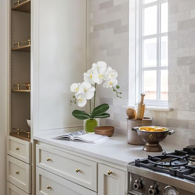- Faux Orchids Plants for Home Decor - These artificial orchid plant blend seamlessly into any interior style. Style this faux potted flowers on a mantel for a bold centerpiece or place it to accent home offices, spa bathrooms, or coffee tables. It is a perfect decoration to your office, shelf, bathroom, living room, bedroom, window, table centerpieces, dining room, cabinet, desk, kitchen, foyer, hotel, etc. Its simple and realistic design will match any decor style perfectly