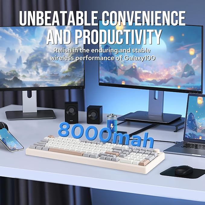 - Long-Lasting Wireless Performance: Powered by the outstanding 8000mah battery, the Galaxy100 keyboard gives you convenience and productivity. Packed with three modes of connection, the Galaxy100 keyboard offers reliable 2.4Ghz wireless, low-latency cable mode, and versatile Bluetooth connectivity. Indulge yourself in continuous gaming sessions with no hassle of cable nor interruptions from charging, and relish in the enduring and stable performance made possible by Galaxy100 keyboard