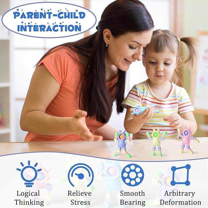 - 【Easter Gift Toys】24 pack finger spinners, you can create any shapes you want, such as various shapes of spinners, robots and even mobile phone holders. It can also exercise your kid’s hands-on ability, hand-eye coordination and logical thinking ability by changing the shape of the toys. The robot's head can also press to help you release pressure.