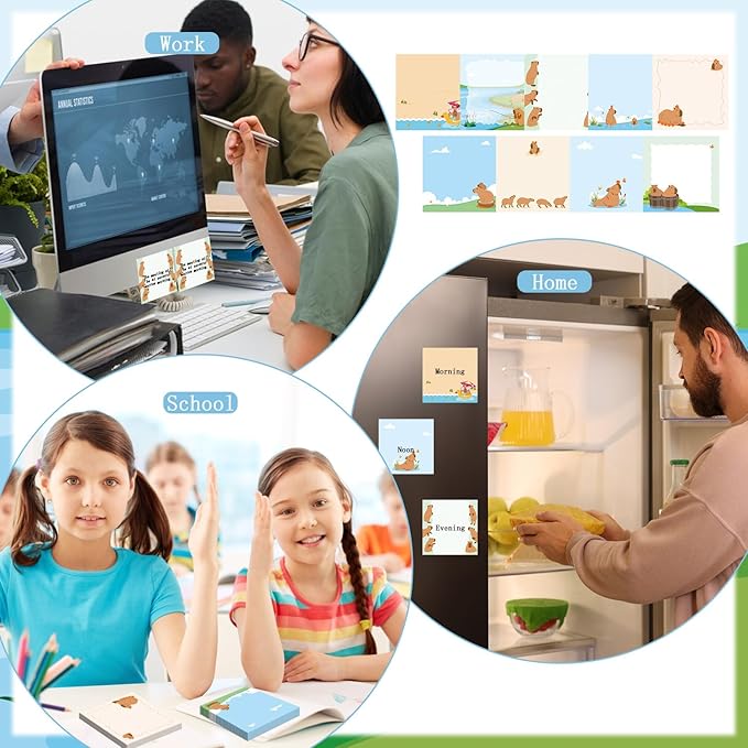 - Occasions: Capybara note pad set is versatile and perfect for office, school and home use, can be used for reminders, notes and memos, time management and organisational sorting, daily reminders, to-do lists, etc. And capybara self-adhesive note pads are also cute capybara gifts for capybara enthusiasts, friends, family members, students, teachers, co-workers and so on.