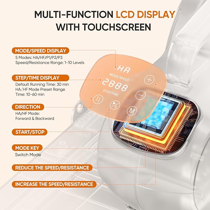 - 【Touchscreen LCD Display】The easy-to-read LCD display shows your exercise data, including mode, time, speed, resistance, and counter. This LCD display also features touchscreen functionality, enabling you to adjust the desired exercise mode by tapping the screen