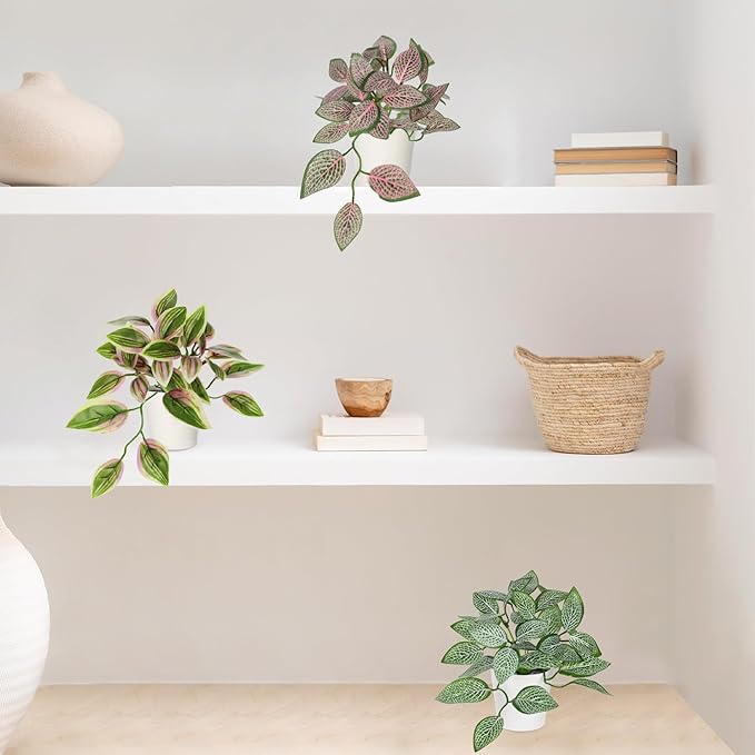 - Artificial Plants Indoor: You will get 6 completely different faux plants indoor(green Fittonia plant*1,green&pink Wandering Jew*1,red Fittonia plant*1,green Wandering Jew*1,green&yellow Wandering Jew*1, green pothos Peperomia*1). Each fake plants potted comes already set in its own plastic pot for easy displaying, no need to assemble, you can directly decorate your house after you get it