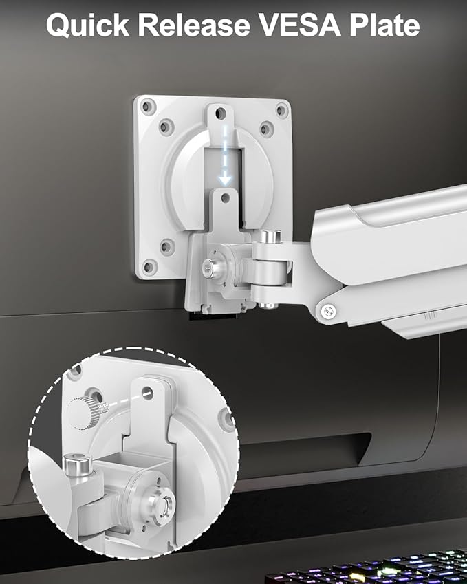 - Effortless and Flexible Installation : Our desk monitor mount is quick and easy to install with the included hardware and instruction manual. Unique quick release VESA plate design for easy installation. Simply attach it to the edge of your desk and adjust to your desired position in minutes