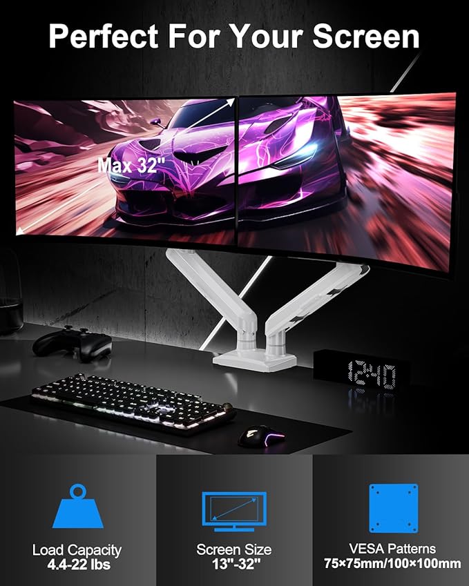 - Wide Compatibility : Freelift Pro gas spring dual monitor mount provides upgraded loading capacity and can securely and easily hold monitors 17,19,21.5,22,23,24,27,32 inches and supports 4.4-22lbs monitors each arm. Compatible with VESA 75x75mm and 100x100mm. We provide both a C clamp and grommet kit meeting different needs of desk.