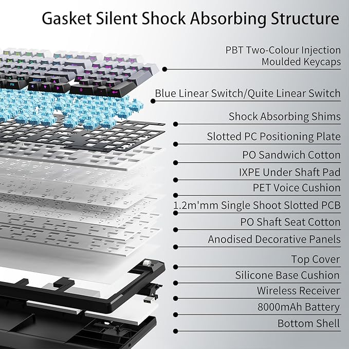 - 【Gasket Mount with Sound-Dampening Structure】 The X99 keyboard features a premium gasket mount design with a five-layer sound-dampening structure. This unique configuration enhances typing comfort, reduces noise, and delivers an exceptionally soft and responsive keystroke. Say goodbye to hollow sounds and enjoy a refined, quieter typing experience.