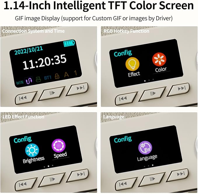 - 【Smart TFT Display Screen and Knob】Full size gaming mechanical keyboard has unique metal knob inspired by the shape of PVZ's trash can and improved for comfort, and knob can quickly adjust complex functions: connection, system, backlight brightness/speed , RGB mode/color, volume and language. Built-in smart TFT color display screen, you can quickly check the status of the keyboard, including custom gif images (by the driver), connection mode, time, lighting effects, power, etc.