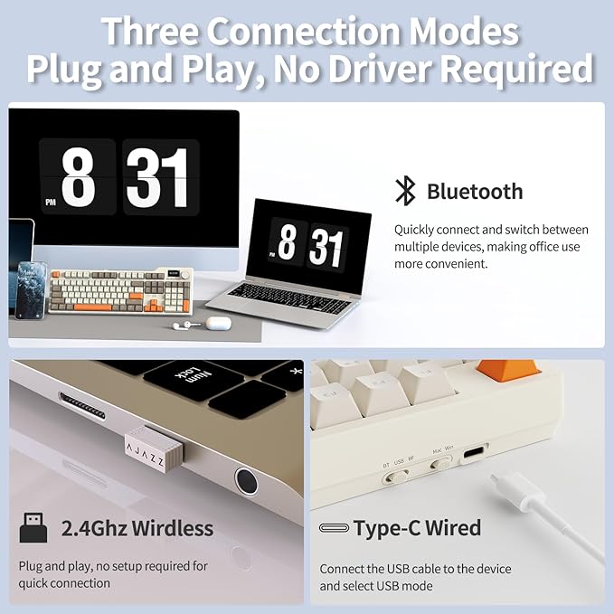 - 【Tri-Mode Connection Rechargeable Keyboard】104 key hot swappable mechanical keyboard built-in 8000mAh amazing battery capacity, it adopts tri-mode connection technology, wired type-c, BT5.1 and 2.4Ghz wireless modes, and is compatible with Win and Mac systems, you can easily switch to any mode and system suitable for your device through the toggle switch, making it the perfect choice for your daily work and gaming.