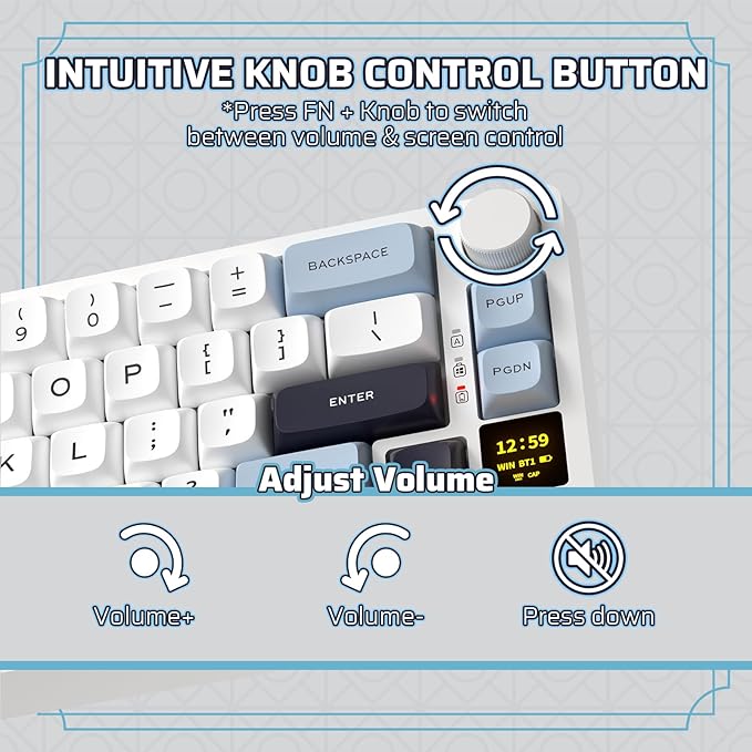 - Intuitive Volume Knob — Crafted with a convenient knob, effortlessly adjust volume, Win/Mac layouts, backlit brightness/speed, RGB mode/color with a simple rotation or pressing