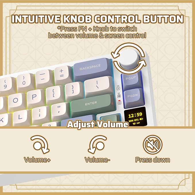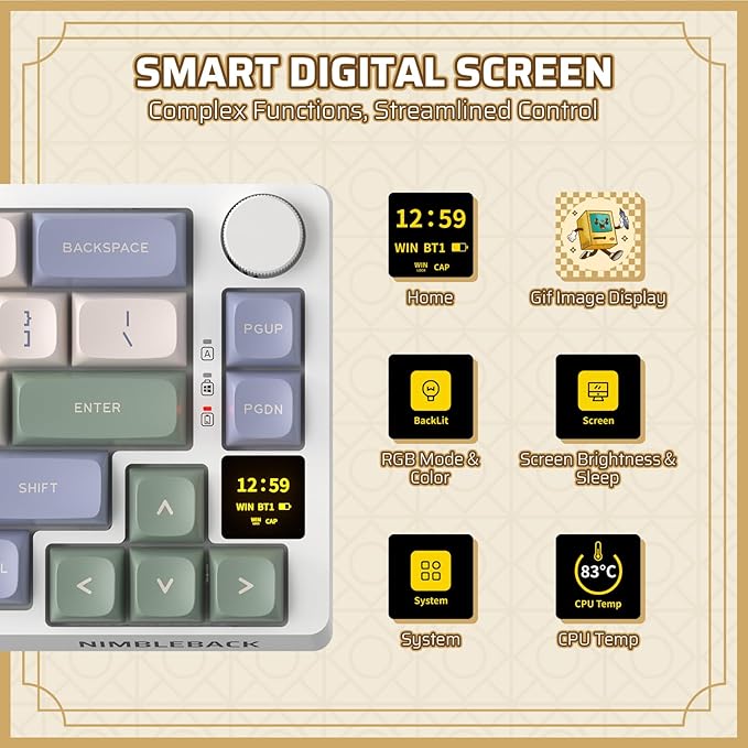 - Compact Screen, Infinite Possibilities — Elevate your control experience with our multifunctional display screen. Keyboard with screen could showcase GIF images, time, battery status, switch WIN/MAC layouts, adjust lighting effects, color, speed and monitor CPU status, etc