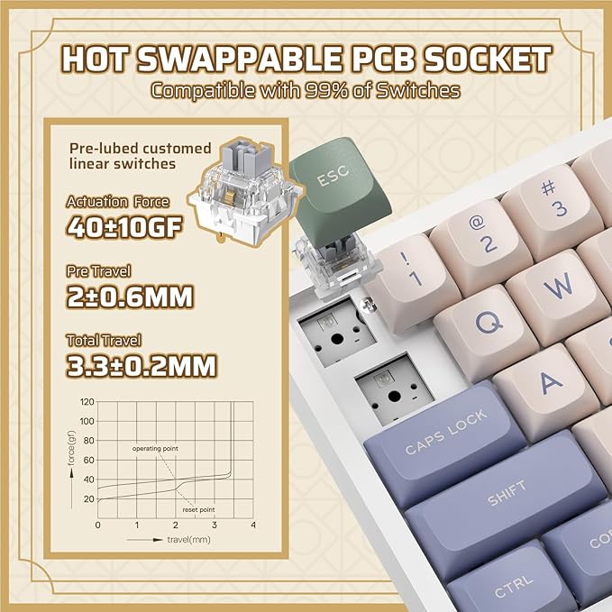 - Customizable Hot-Swap Design — DIY your keyboard effortlessly with our hot-swappable PCB, replacing most 3-pin and 5-pin switches without soldering. Compatible with popular MX-style switches like Gateron and Kailh for personalized performance