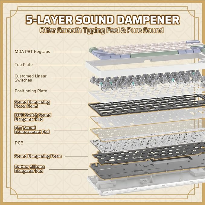- Five-Layer Sound Padding — With five layers of internal padding, including four dampening mats that significantly minimize hollow sounds and cavities noise and one PET sound-enhancement film, typing becomes remarkably smooth and pleasing. Complemented by MDA profile oil-resistant PBT keycaps for enhanced typing comfort