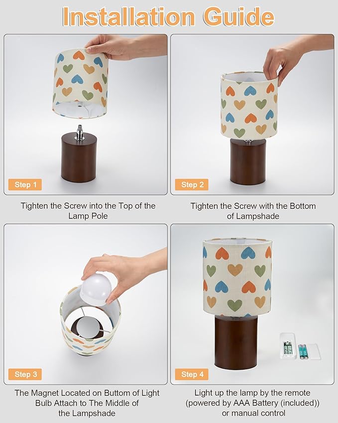 - STYLISH & VERSATILE DESIGN: Featuring a modern cylindrical lamp body with a wooden base, this small cordless table lamp is as stylish as it is functional. It comes with a playful heart-shaped fabric lamp shade; this lamp adds charm to any room. Perfect for home office, bedroom, living room, bedside, entryway, side table, end tables, farmhouse shelf, guest room, kitchen counter, console table, or even in a classroom, this rechargeable lamp also makes a great gift for loved ones