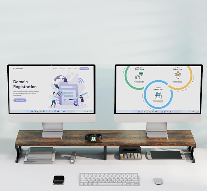 - Large Storage Space: The dual monitor stand riser has extra space for keyboard, sticky notes, mouse, DVD players, iPad and other office supplies. Extra storage space underneath organizes various accessories.