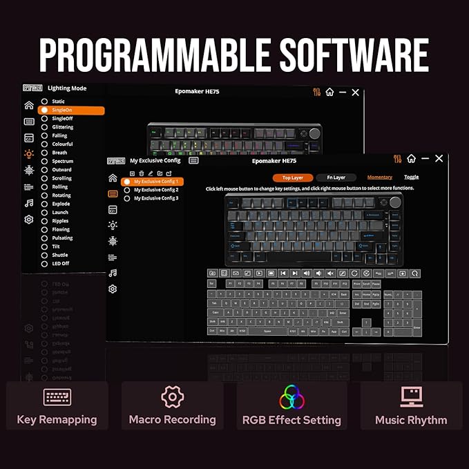 - Mechanical Gaming Keyboard with Low Latency: Equipped with hot-swappable EPOMAKER Flamingo Switches, the HE75 mechanical keyboard types smooth and responsive with unparalleled precision and control. The anti-ghosting feature and the factory-lubed switches bestow HE75 keyboard the 2ms low latency in cable mode, while the versatile Bluetooth and 2.4G wireless mode make it ideal for cross-system flow between WIN, macOS and Android devices. Designed for competitive gamers and intensive office work, the HE75 keyboard elevates your performance with unique functionality