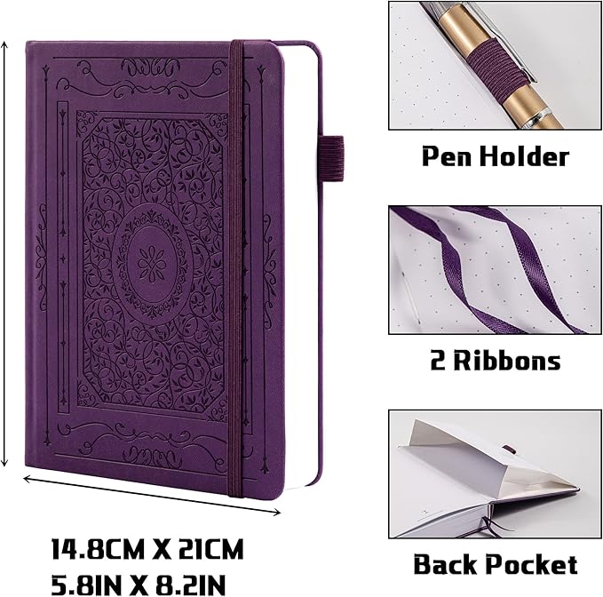 - A5 Hardcover Dotted Journal: The A5 Dot Matrix Notebook is the perfect combination of style and function. With an elasticated pen loop, two ribbon bookmarks, signature page, lanyard, and expandable inner back pocket, making this dot notebook a must-have for anyone looking to stay organized. Jot down your fun facts and thoughts in this special bullet point dot journal.