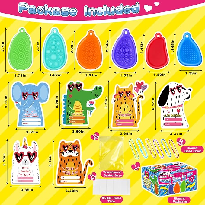 - Super Value Pack - Our 36 Packs Sensory Worry Stones with Gift Cards Set includes 36 cute animals cards with 6 designs and 36 Fidget Toys Sensory Stones, 36 pcs Transparent sealed bags and 36 double-sided glues & Ball chain