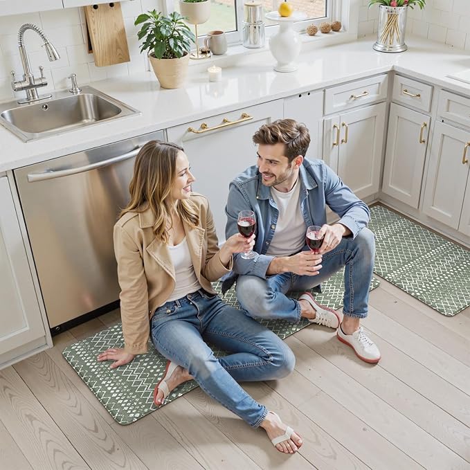 KIMODE Kitchen Mats for Floor Anti Fatigue, Green Boho Kitchen Rugs Sets of 2, Cushioned Kitchen Floor Mats, Comfort Standing Mat for Sink Laundry Office Desk 17"x47"+17"x29"