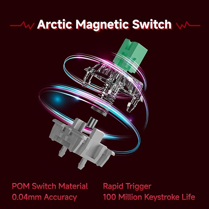 - Hall Effect Magnetic Switches With Rapid Trigger Technology: Battle68 gaming keyboard features Hall Effect magnetic switches for unmatched speed and precision. Offering adjustable actuation with an accuracy of up to 0.02mm, this magnetic switch keyboard eliminates the need for traditional physical switches, delivering faster response times for competitive gaming. Perfect for FPS, MOBA, and rhythm games, providing an edge over your competition.