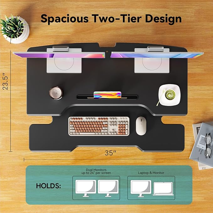 35" Standing Desk Converter, Height Adjustable Desktop Riser with Keyboard Tray for Two Monitors, Sit to Stand up Computer Workstation for Home Office, Black
