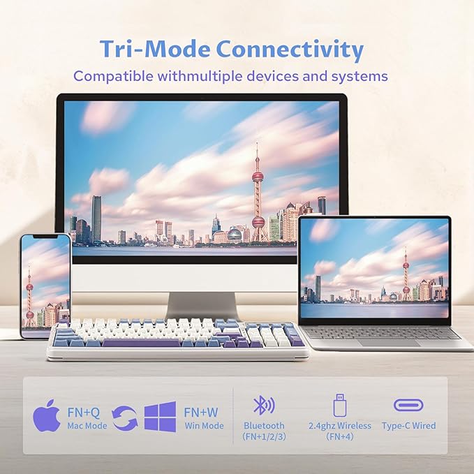 - Tri-Mode Connectivity with 8000mAh Battery: Powered by two 4000mAh batteries, the Cypher 96 keyboard gives its best performance for long hours without constant recharging. Multitask with this Tri-mode gaming keyboard that is outstanding at FPS battlefield and unbeatable at office work. Type away right out of box with the durable USB-C cable or enjoy the wireless 2.4Ghz with low latency, while the Bluetooth 5.0 mode connect to three devices simultaneously across Mac, Win and Android