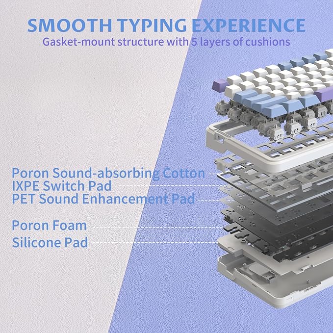 - Gasket-Mount with Enhancement Fillings: Embrace the premium typing experience with the Cypher 96 keyboard, which offers satisfying typing sound and feel with carefully constructed inner design. The Gasket-Mount structure reduces inner vibration to prevent hand fatigue and harsh sound, while five layers of Poron, IXPE, and silicone pads cushion the inner space for creamy and clam typing sound. The PED sound-improvement film brings out the thocky switch sound for a quiet asmr, while the tuned and lubed stabilizer ensures smooth and stable typing without rattling or inconsistence