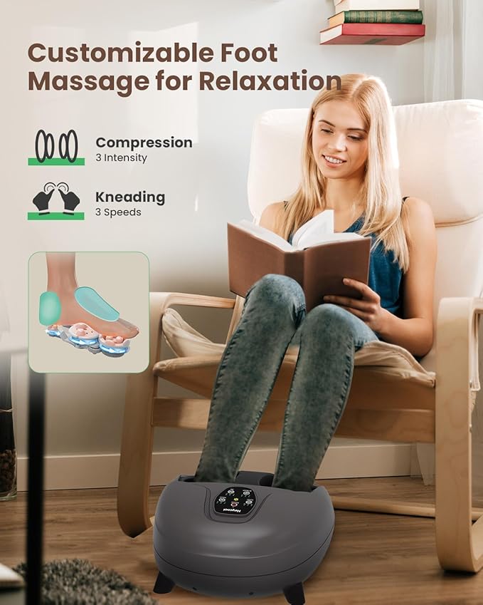 - Advanced Heating System: Experience ultimate warmth with dual heating zones. The foot massager machine features soothing sole heating and innovative carbon fiber heating for the tops of your feet. Carbon fiber technology ensures rapid heating, even heat distribution, and long-lasting warmth. With three adjustable heat levels, you can customize the temperature for a cozy experience.