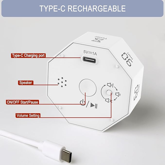 - Compact & Rechargeable: With the size of 2.36*2.36*1.1 in(6*6*2.8 cm), this digital timer is very portable. You can carry it to any place you need such as classroom, library, office and so on. This timer is Type-C rechargeable, very convenient and long-lasting