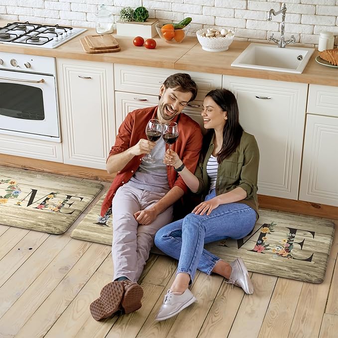 KIMODE Anti Fatigue Mats for Kitchen Floor,Farmhouse Floral Rugs Sets of 2,Cushioned Carpet Non Slip,Wide Memory Foam Runner for Bathroom Sink Laundry Office,Beige 20"x47"+20"x32"