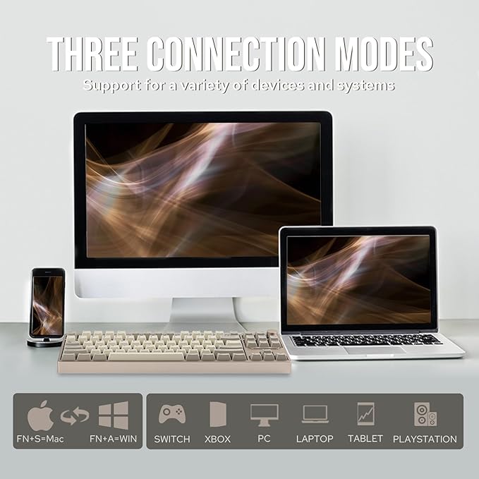 - Wire-free Convenience: For users of all devices and OS systems, the EPOMAKER P87 is compatible in cable, wireless 2.4Ghz or Bluetooth 5.0 with Mac, Linux and Mainstream Gaming controllers. Relish in the hassle-free USB-C cable mode for ultra-fast low latency, or the cluster-free wireless mode in stable 2.4Ghz and versatile Bluetooth mode. Switch between Mac/Win mode with FN+A/S for cross-system multicasting, and stream through the digital world with the tri-mode P87 keyboard as your ideal companion