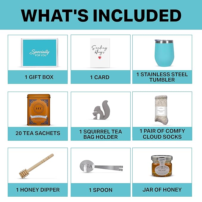 - Thoughtful Gift Set for All Occasions: Show your support and bring joy to your loved ones with a carefully curated get well gift box. Each set includes cozy socks, a reusable teal stainless steel tumbler, premium tea sachets, and a honey jar with a honey dipper. Whether it's for recovery, sympathy, or just to show you care, this gift basket is perfect for any occasion including mothers day gifts, gifts for mom.