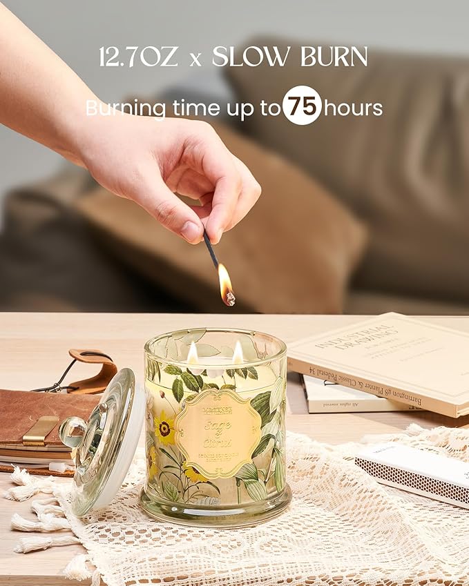 M&SENSE Sage Citrus Scented Candles, Natural Organic Soy Candle 12.7oz 75H Long Lasting Slow Burning, 2 Wick Large Jar Candle Stress Relief Air Purifying, Gifts for Men Women Father
