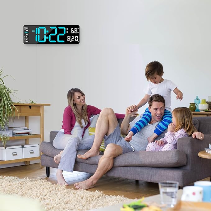 Digital Clock, Digital Wall Clock for Living Room Decor, Desk Alarm Clock for Bedroom, Large Wall Clock with Remote Control, Automatic Brightness Dimmer LED Clock with Date Temperature Week (Blue-B)
