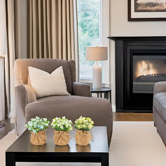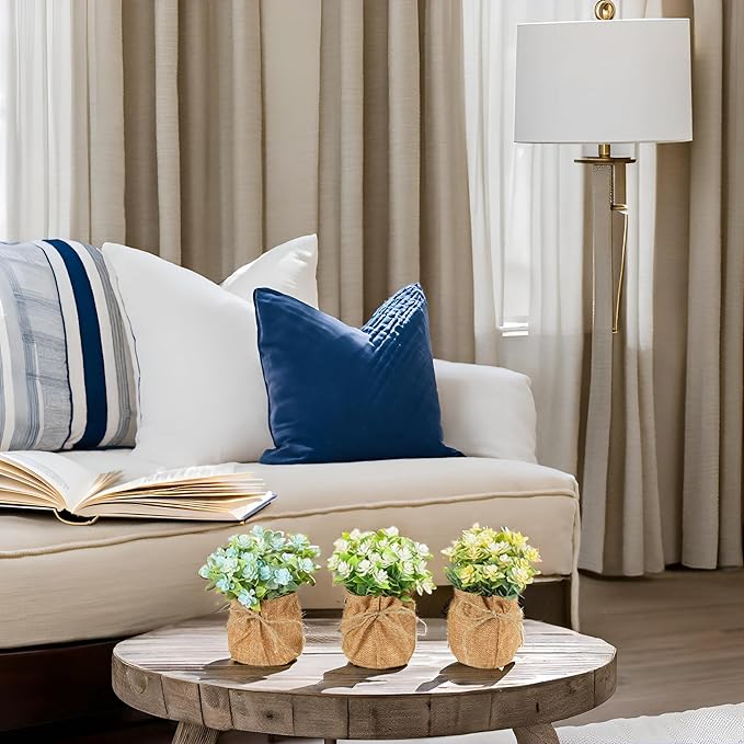 - [Miniature Real Touch Flowers Bouquet in Burlap Flower Vase]: The faux flowers in a linen burlap pot comes in a set of 3 where each pot measure 3 x 6 x 6 inches. The fake flowers come in blue, yellow & White. Made from allergy friendly PE materials, the small fake flowers offer nearly natural looking petals and foliage textures, that add a soft, soothing and realistic blooming vibe to your decor. They are hassle-free to maintain and can be cleaned with just a damp cloth.