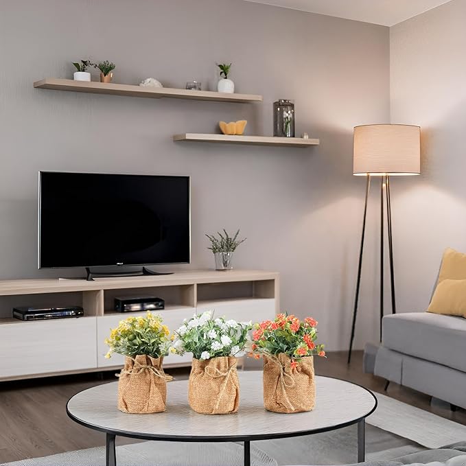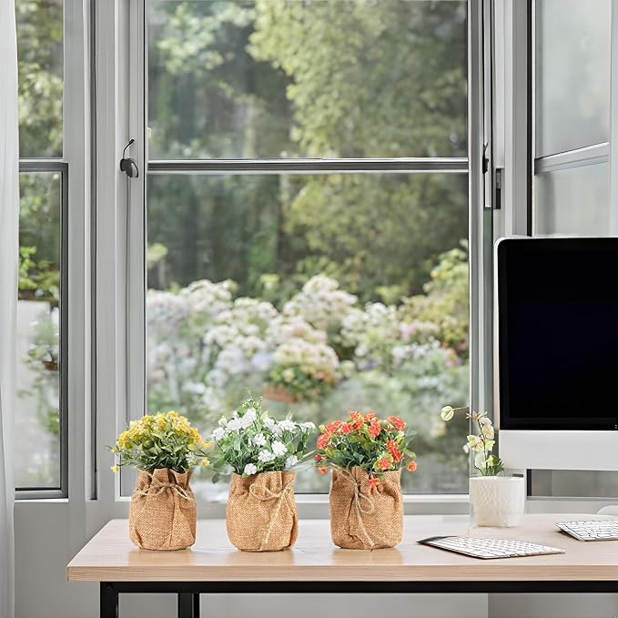 - [Miniature Real Touch Flowers Bouquet in Burlap Flower Vase]: The faux flowers in a linen burlap pot comes in a set of 3 where each pot measure 5 x 5 x 7.5 inches. The fake flowers come in red, yellow & White. Made from allergy friendly PE materials, the small fake flowers offer nearly natural looking petals and foliage textures, that add a soft, soothing and realistic blooming vibe to your decor. They are hassle-free to maintain and can be cleaned with just a damp cloth.
