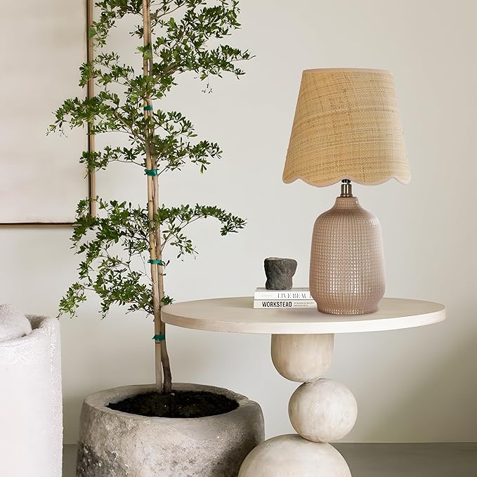Pia Ricco 19" Modern Ceramic Table Lamp for Living Room Gray Camel Base Desk Lamps for Bedroom Farmhouse Bedside Nightstand Lamp End Table Lamps,Pink,Rattan Shade