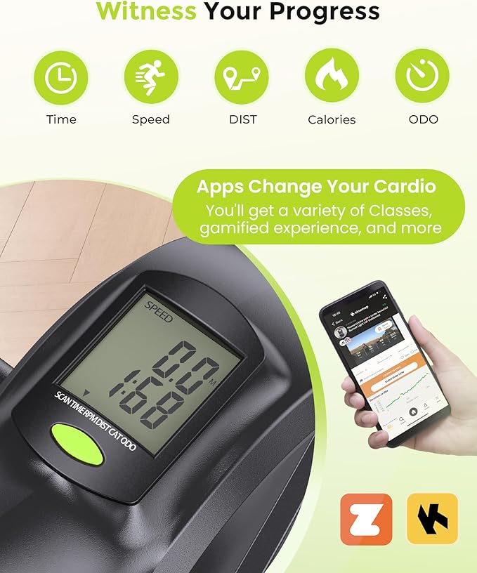 - DIGITAL MONITOR: screen tracking of workout data: heart rate, mileage, speed, calories. Under desk bike pedal exerciser can also be Bluetooth connected to KINOMAP and Zwift, so that you can easily grasp your body data and follow tutorials to exercise