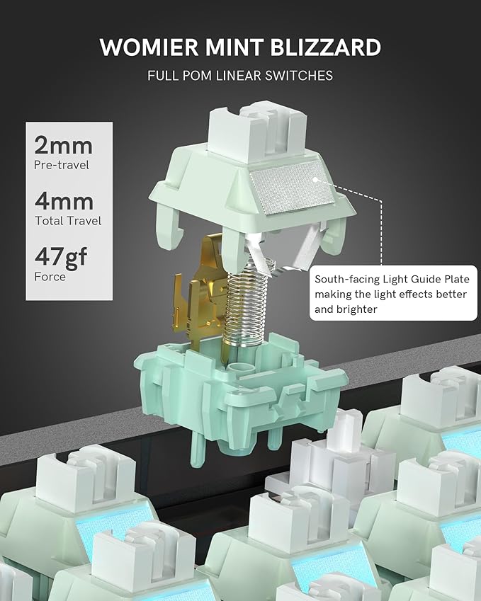 - 【South-facing RGB Backlit】This rgb keyboard adds a south-facing light guide plate into each linear switch, making the light effects more well-distributed. Equipped with multiple lighting effects and customizable color and brightness settings, this backlit keyboard adds a vibrant touch to any gaming keyboard. Fn+ | is to switch different lighting effects,Fn+ ]} is to adjust the lighting color, Fn+↓ / ↑is to adjust the lighting brightness, Fn+ ← / → is to adjust the lighting speed