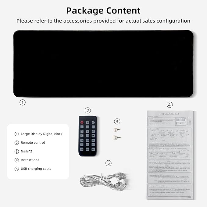 - All-in-One Retail Package – Comes complete with the Digital LED Clock, USB Power Cable, Remote Control, Nails, and Instruction Manual, ensuring you have everything needed for easy setup and installation right out of the box.