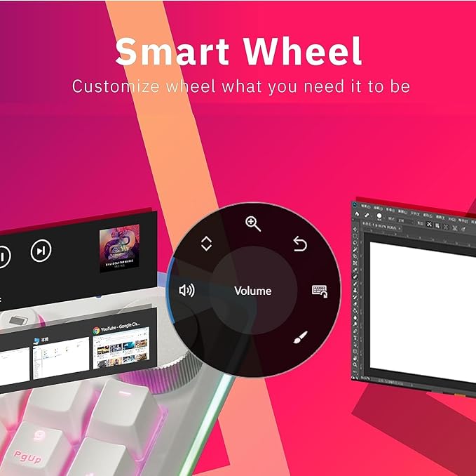 - 【Hotkeys & Smart Wheel】⚡️Hotkeys make your web browsing, media playback, and application access faster than before. With Smart Wheel you can customize your wheel– volume, scrolling, zooming, brush adjustment, video editing, multimedia control, etc