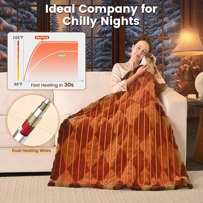 Bearhug Heated Throw Blanket, 50" × 60" Electric Throw, Faux Fur & Warm Sherpa, 4h Auto-Off Timer & 6 Heating Levels,ETL Certified, Machine Washable, Gift Box Packaging