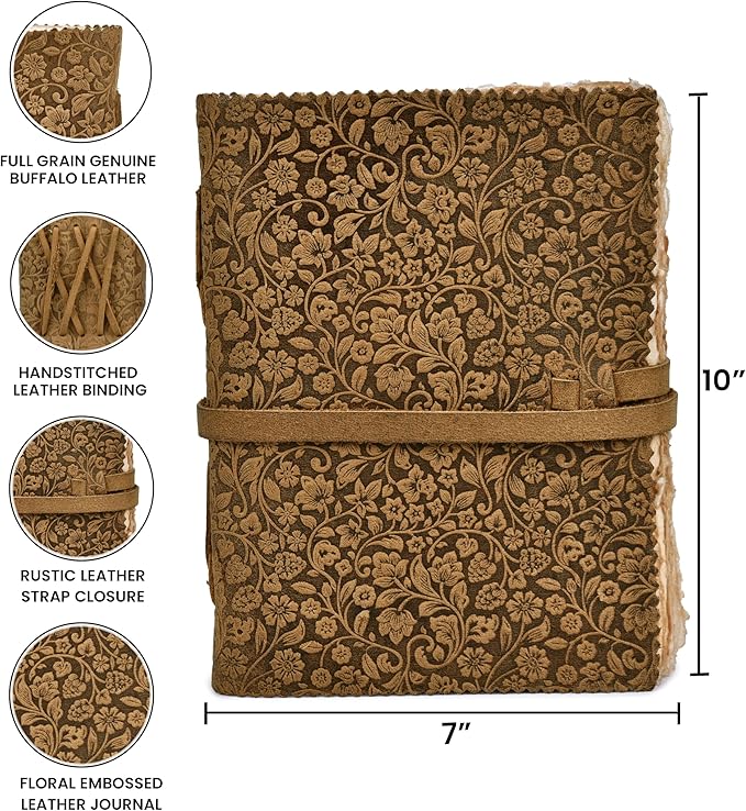 - Genuine Leather Journal: Luxurious full-grain leather cover, naturally tanned for an authentic feel. Embrace the craftsmanship with this durable, Floral embossed leather notebook, ideal for writers, travelers, and journal enthusiasts seeking a premium writing experience.