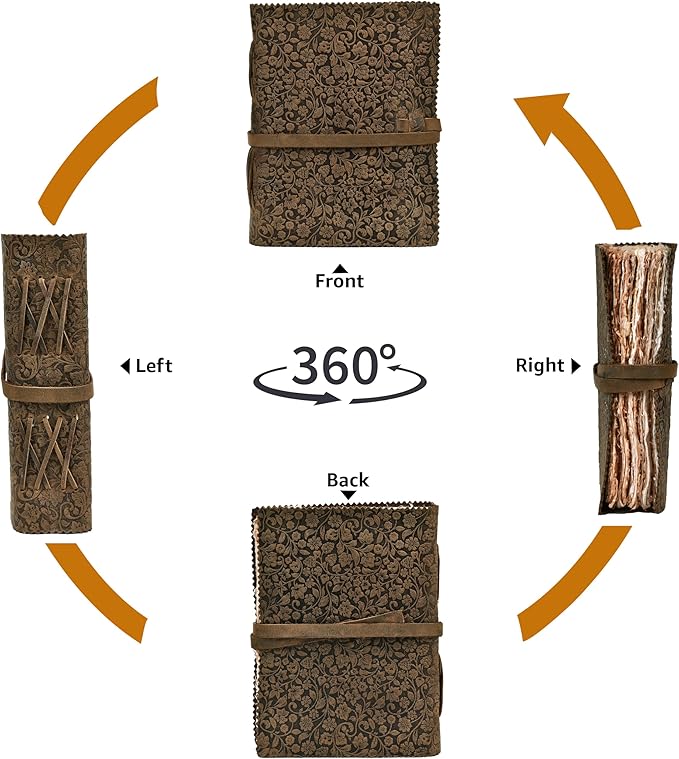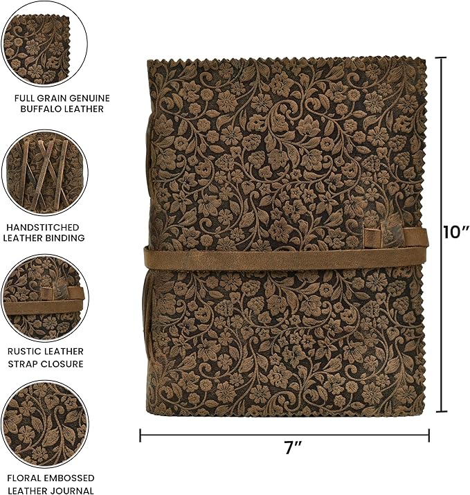 - Genuine Leather Journal: Luxurious full-grain leather cover, naturally tanned for an authentic feel. Embrace the craftsmanship with this durable, Floral embossed leather notebook, ideal for writers, travelers, and journal enthusiasts seeking a premium writing experience.