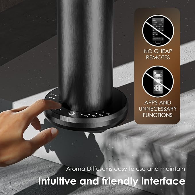 - Easy to operate: Say goodbye to complicated settings with the simplest touch of a button!4 time settings (2H,4H,6H,8H) and 4 fog intensity settings (L,M,H,H+), set the mode that suits you anytime, anywhere, plug in the DC Adapter to use. bottle capacity 120 ml:(included) (scent not included).