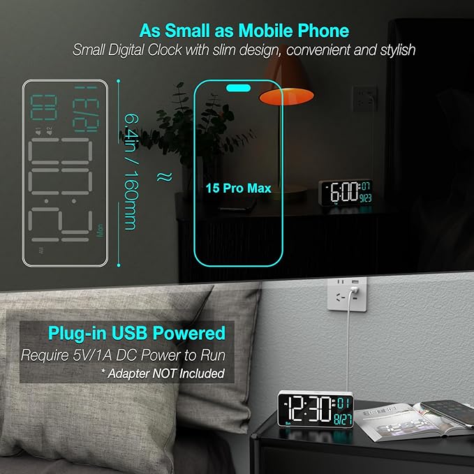 - [Need Plug-in USB-A Power Supply] This digital alarm clock requires a 5V/1A AC adapter (NOT included) to work.