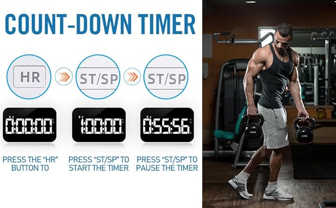 - Rechargeble Large LED Display Timer: No need for additional batteries, built-in battery supports Type C charging(Charging cable included in the package). 5" LED screen and red digital display can work for at least 5 hours in Hight Light Mode. When the battery is low, there is a low battery indicator in the upper left corner.