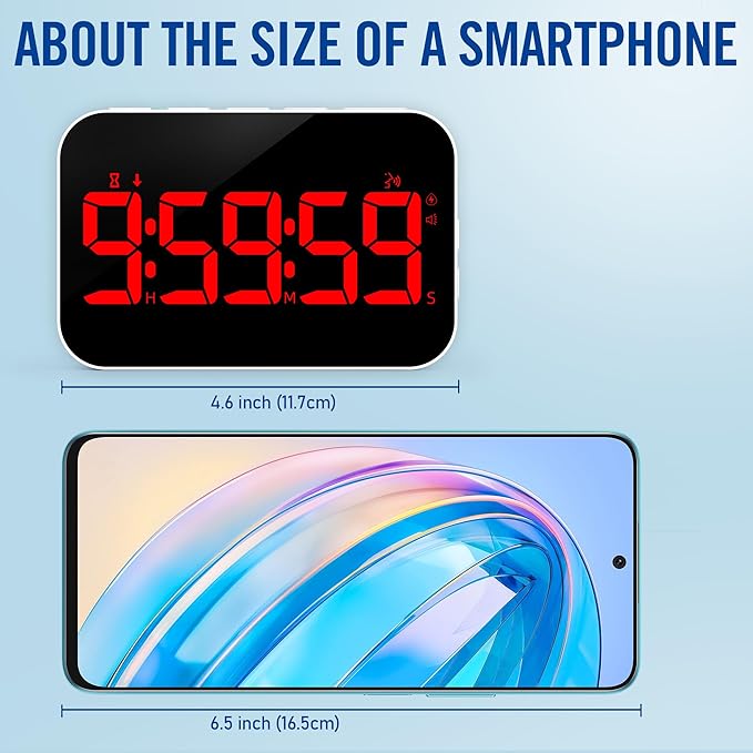 - Rechargeble Large LED Display Timer: No need for additional batteries, built-in battery supports Type C charging(Charging cable included in the package). 5" LED screen and red digital display can work for at least 5 hours in Hight Light Mode. When the battery is low, there is a low battery indicator in the upper left corner.