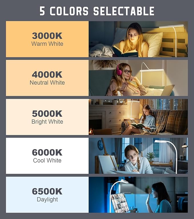 - 5 DIMMABLE & 5 COLOR TEMPERATURE: Variate lighting color (3000K-6500K) and brightness (20% - 100%) with easy touch control for personalized illumination - from cozy warmer light at 3000K to concentration-boosting cooler light at 6500k. Perfect for a variety of activities like reading, working, studying, drawing, crafting, sewing, puzzle, nail and more.