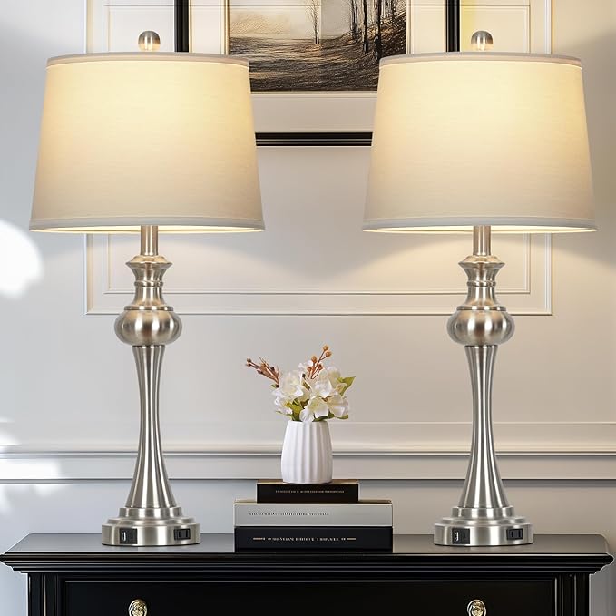 28.75" Silver Table Lamps for Living Room,Touch Lamps for Bedrooms Set of 2 - Nightstand Table Lamp with USB C+A, 3 Way Dimmable Bedside Lamps End Tables Brushed Nickel